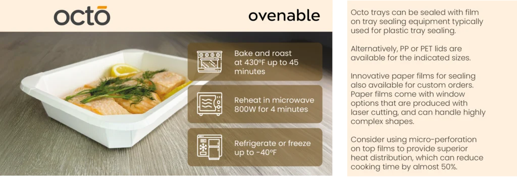 The Octo ovenable paperboard food trays provide a robust and rigid structure, making them an ideal replacement for traditional CPET, WMF, or PP trays. Designed for versatility, these trays can be microwaved, refrigerated, frozen, and used in the oven. They can withstand a wide temperature range, from -40°F to +430°F, for up to 45 minutes, making them suitable for various food applications.