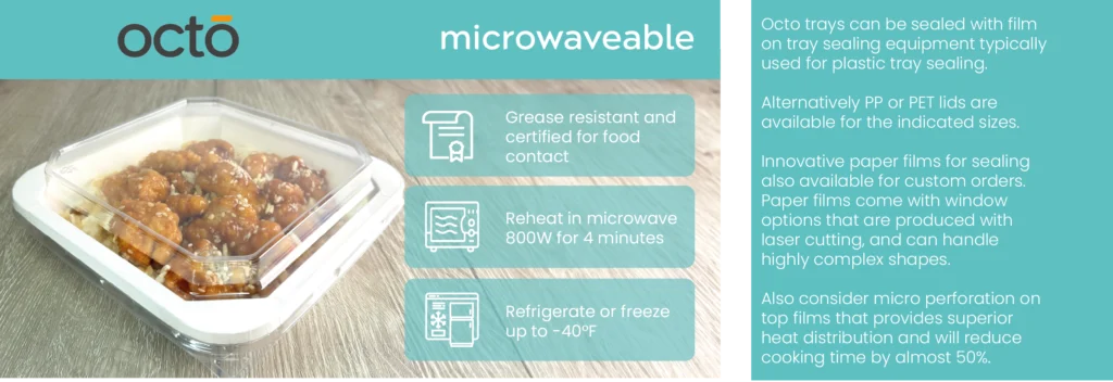 The Octo compostable tray is a home and industrial compostable version of our microwavable tray. It features a compostable coating made from renewable resources, complying with both USA FDA and European food contact regulations. The tray coating is certified by TUV Austria for home and industrial compostability and holds a BPI compostable certification.